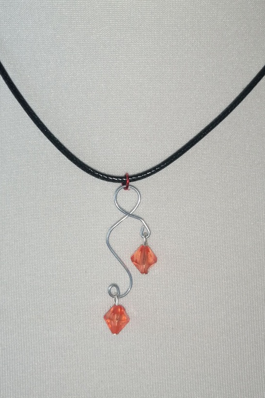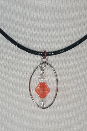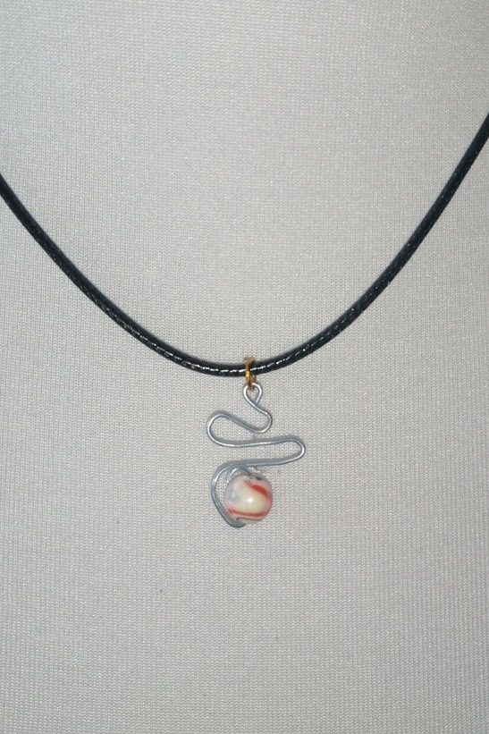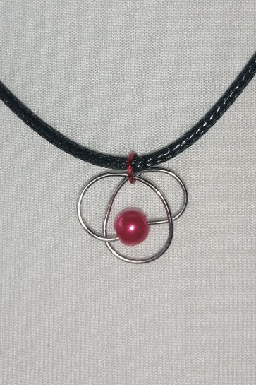 Die Verbindung zwischen Anhänger und Kettenband bildet hier ein farbiger Ring in einem farblich zur Perle passenden Rot.