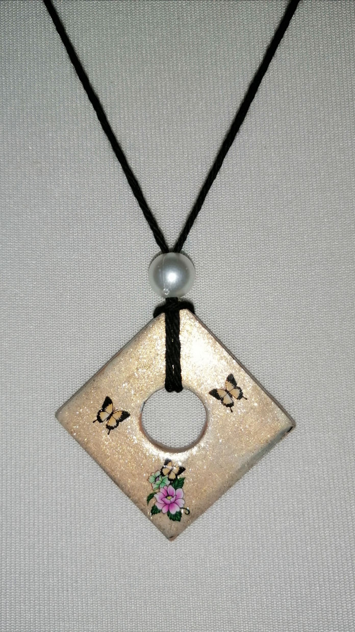 Grundiert in einem hellen Beigeton, überzogen mit einem wunderschönen, goldschimmerndem Glitzer. Geziert wird dieser schöne Anhänger von zarten Schmetterlingen und einer Blume.