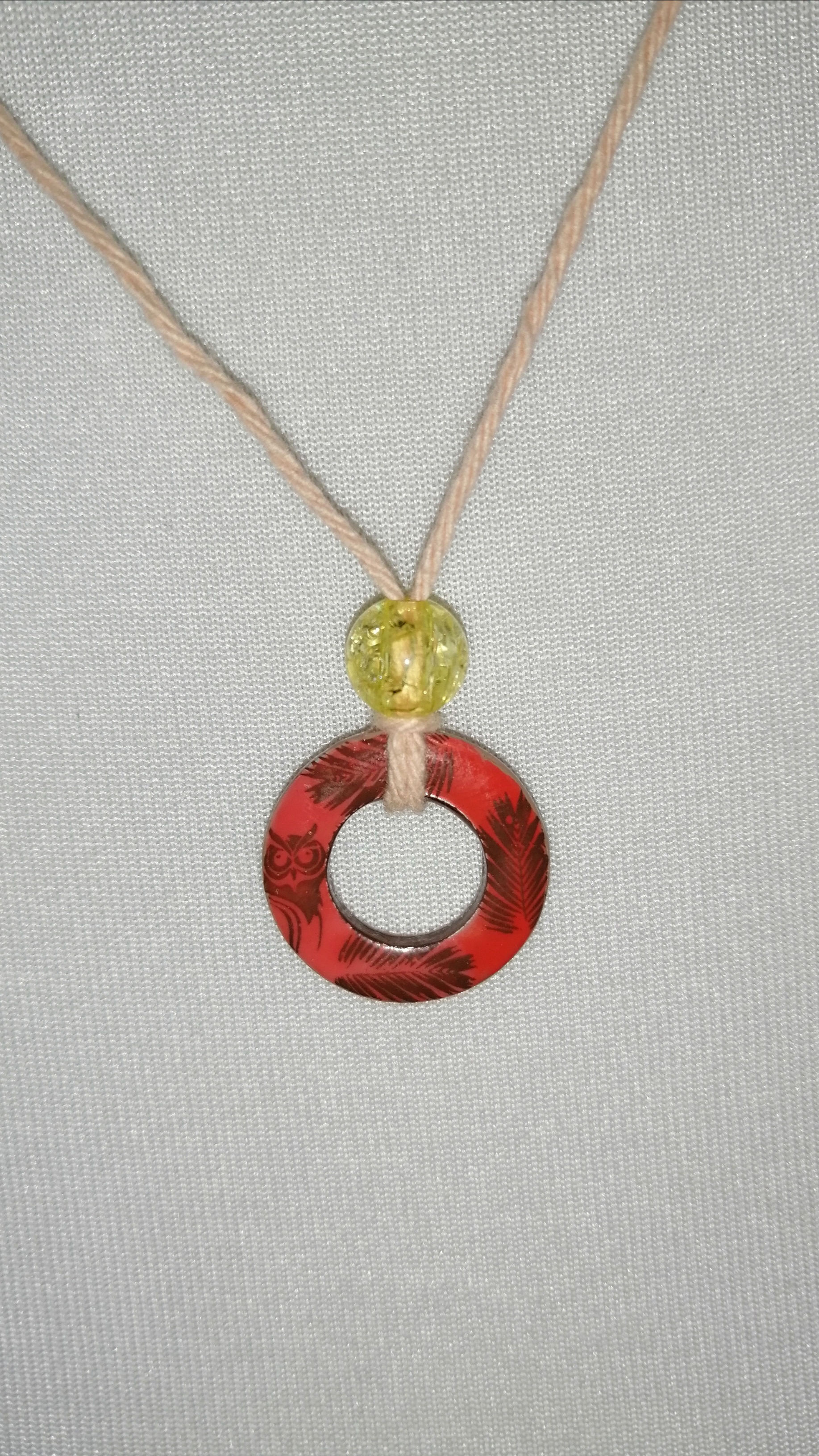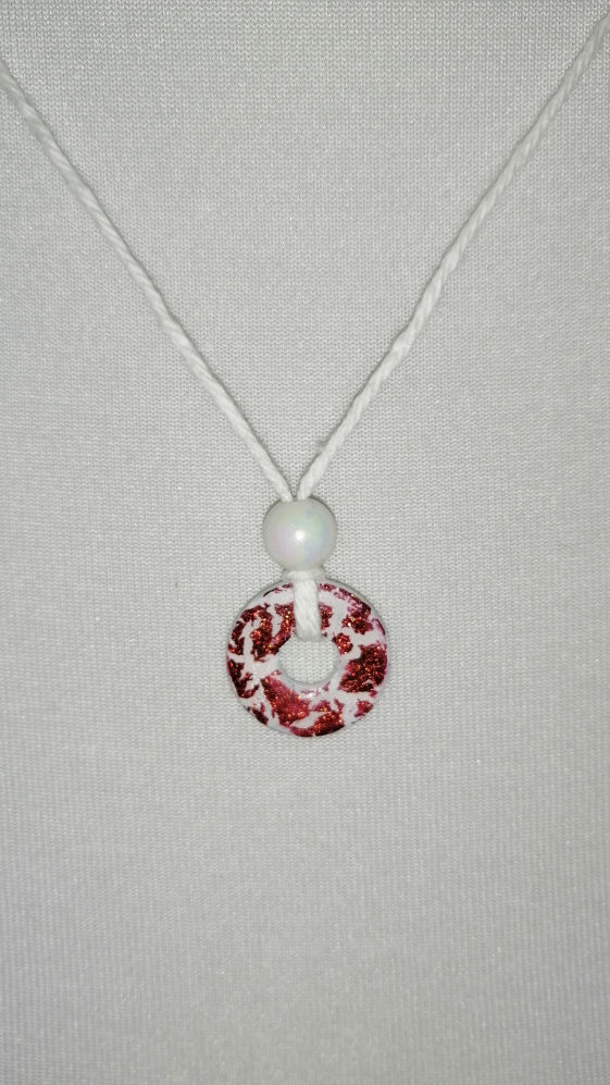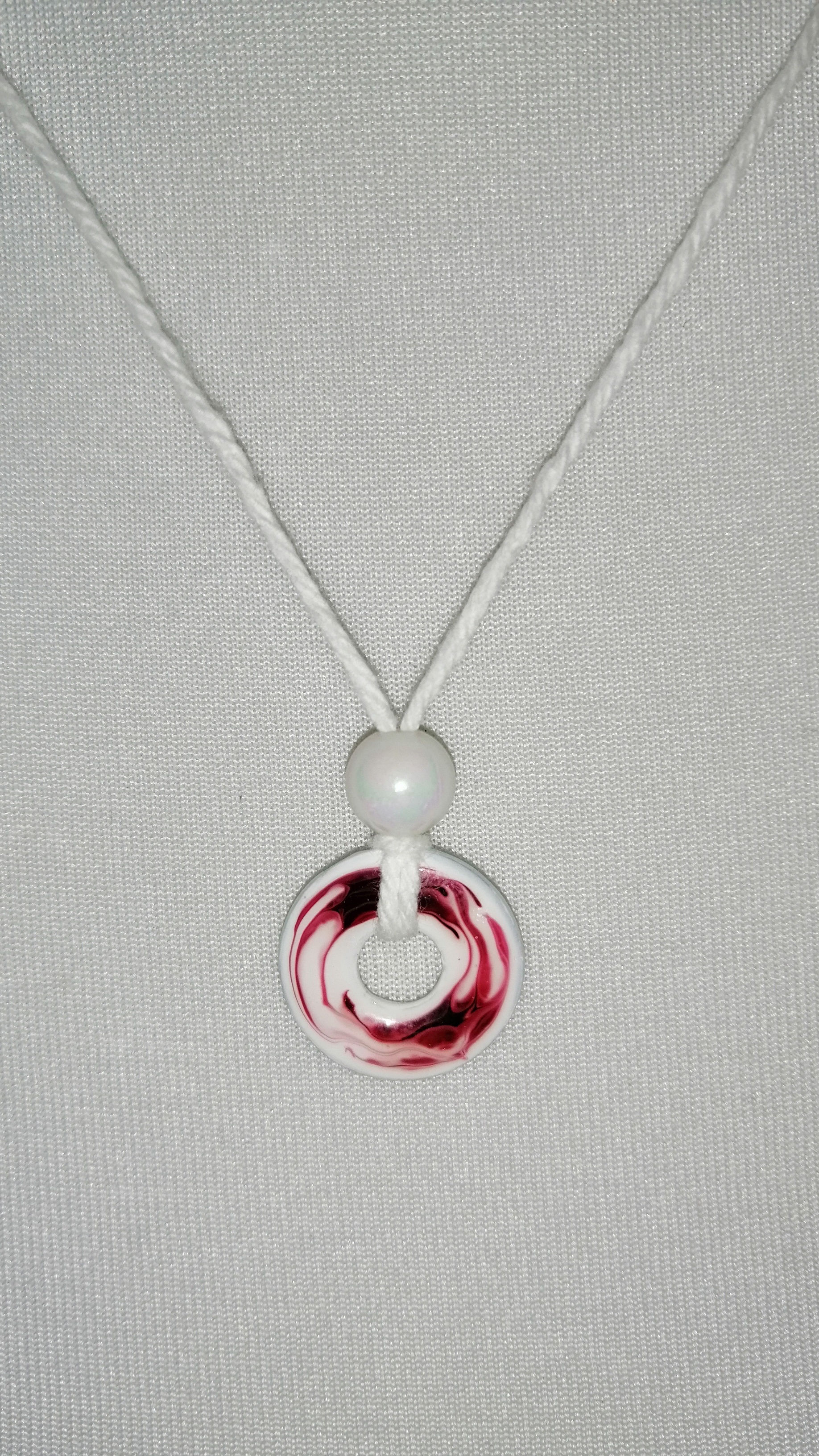 Dieser Anhänger kommt in einem geleeartigen, halbtransparenten, sehr dunklen Bordeaux auf beiden Seitendaher. Die Außenkante ist weiß, ebenso das aufgearbeitete Motiv.
