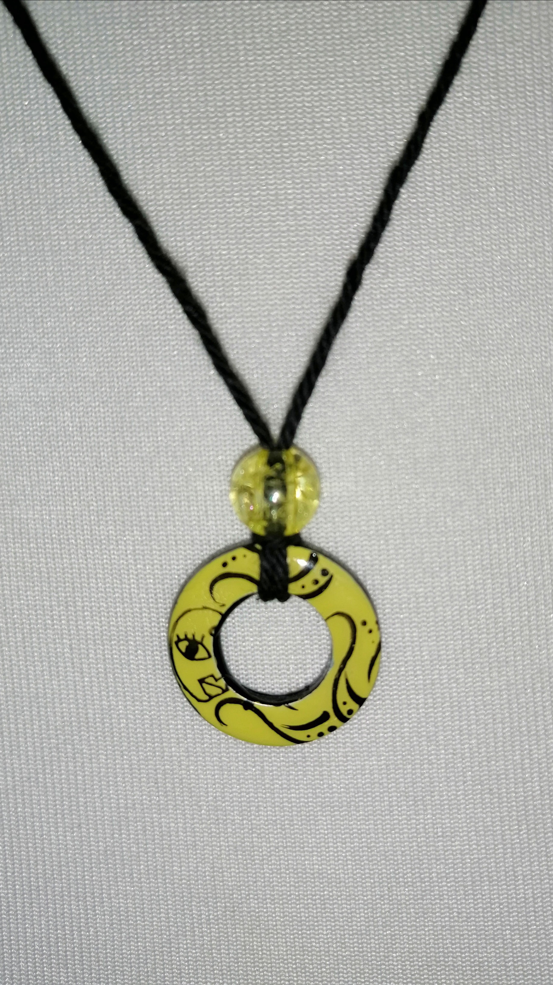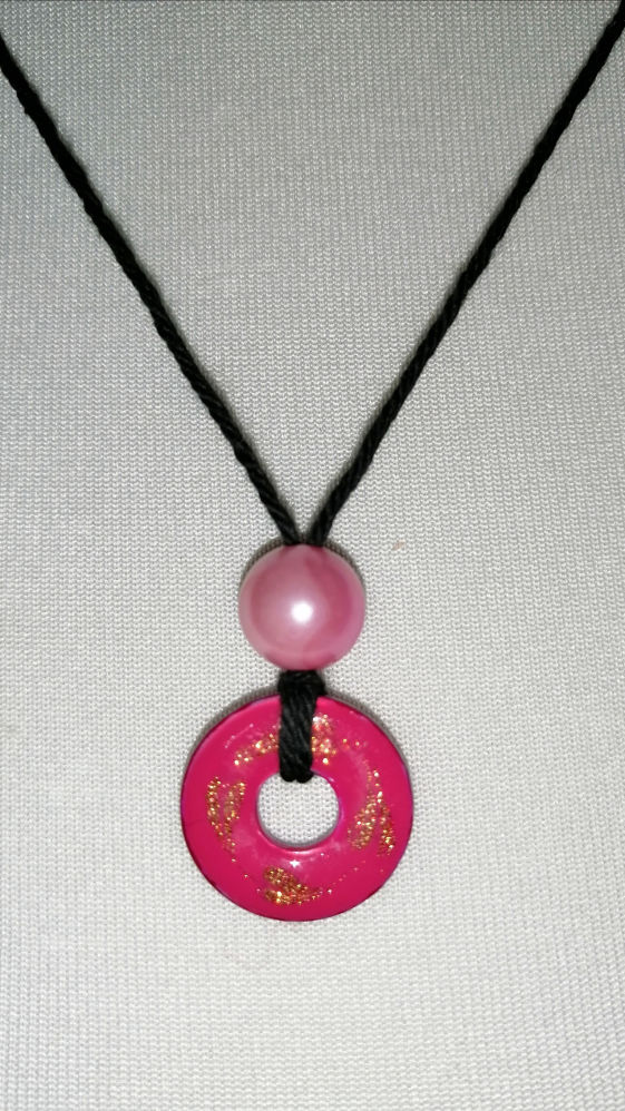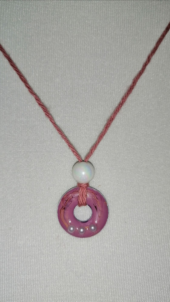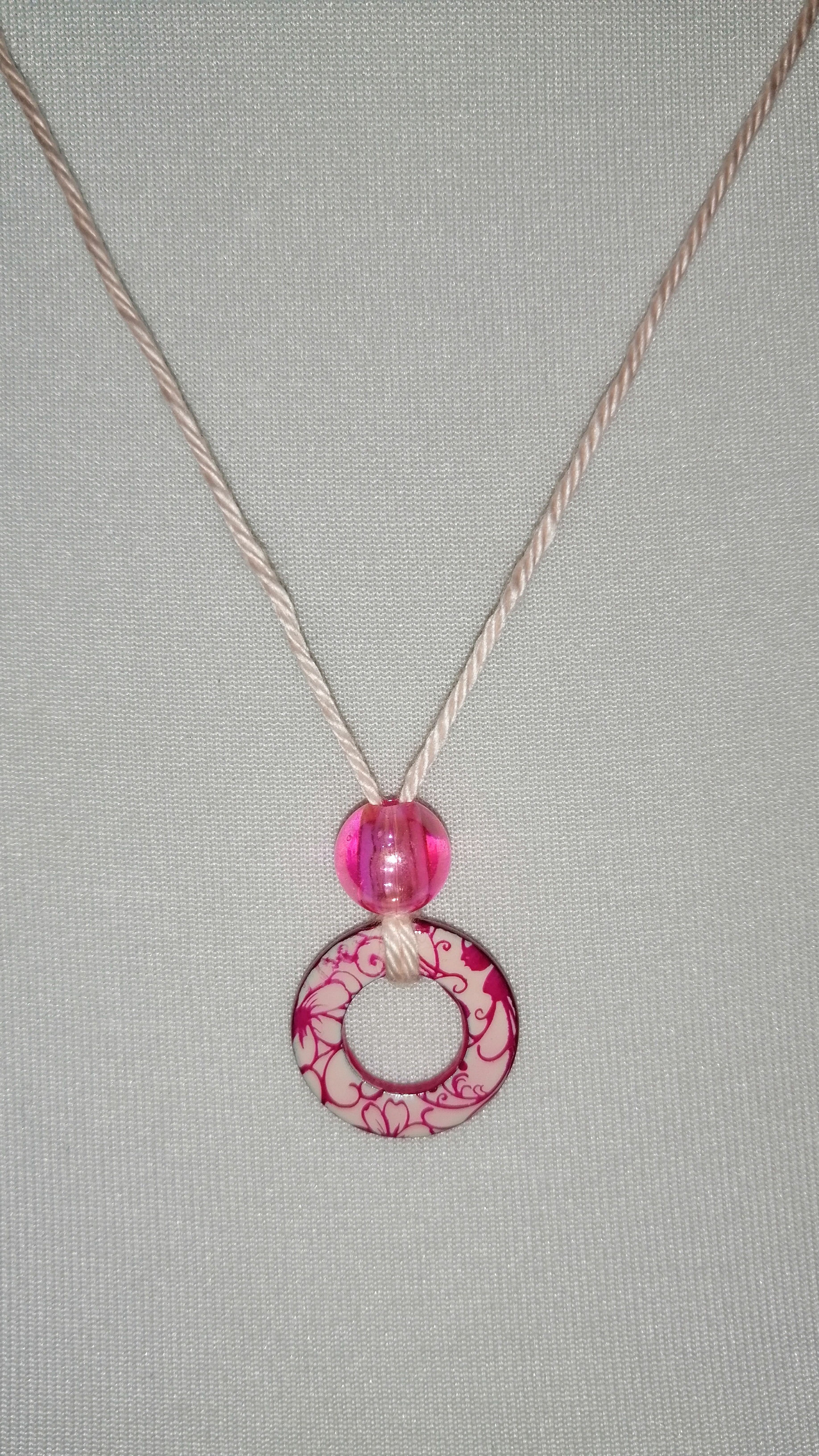 Dieser Anhänger kommt in einem geleeartigen, halbtransparenten, sehr dunklen Bordeaux auf beiden Seitendaher. Die Außenkante ist weiß, ebenso das aufgearbeitete Motiv.