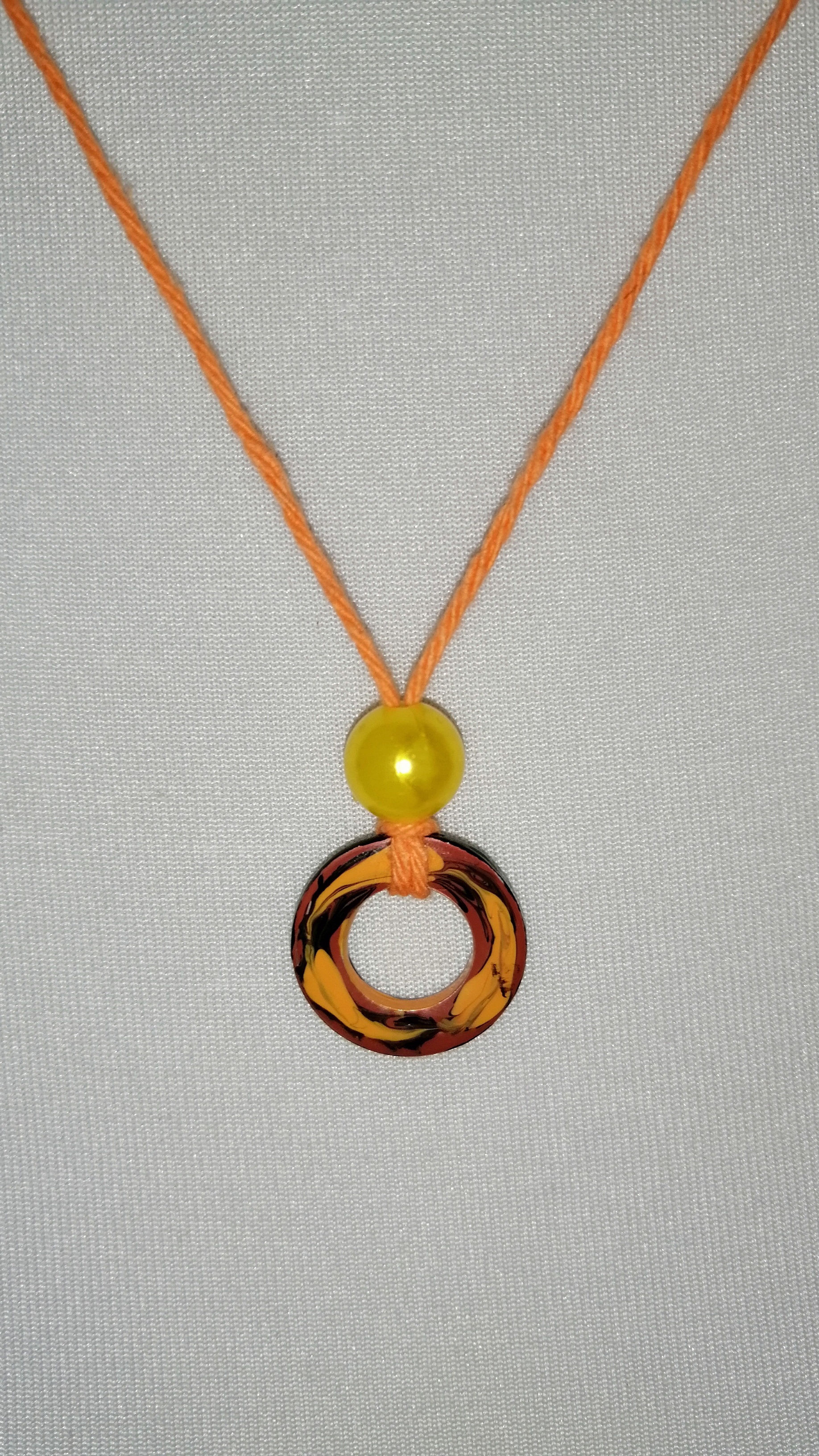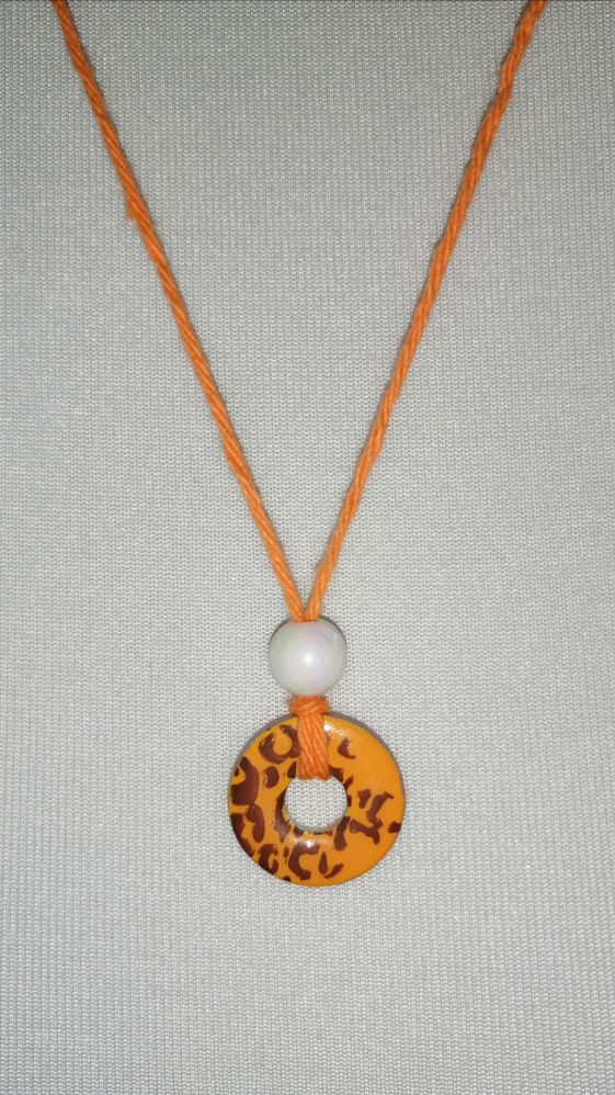 Braune Grundierung trifft hier auf ein Nass-In-Nass-Design in peach und schwarz. Die Rückseite und Außenkante sind schwarz lackiert, die Kante vom Loch peachfarben.
