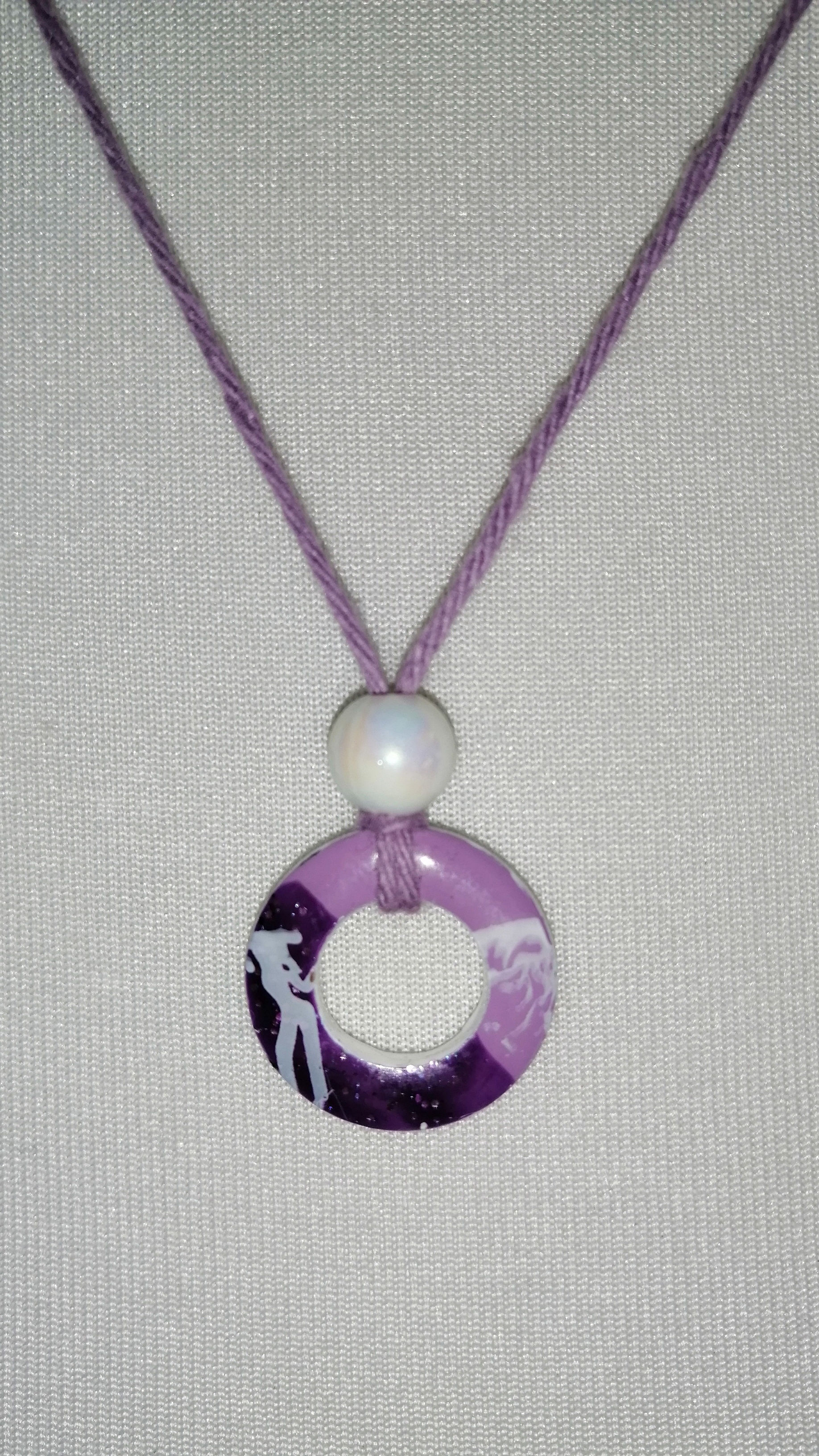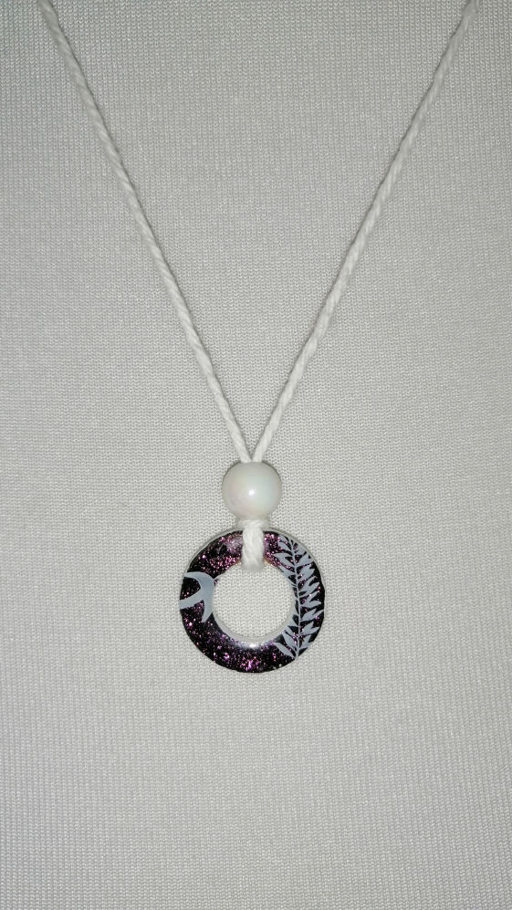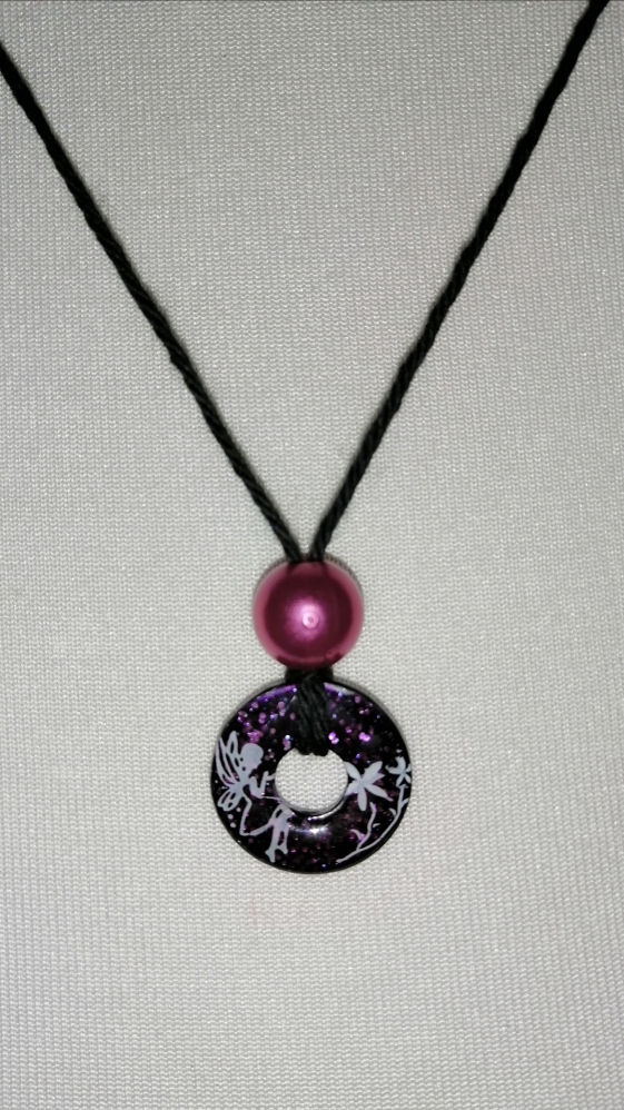 Dunkel und mystisch erstrahlt dieser schöne Anhänger. Grundiert in Schwarz, überzogen mit einem wunderschönen, lilafarbenen Glitzerton, der auf den ersten Blick auf Feenglanz oder Sterne erinnert. In perfekter Harmonie mit dem Hintergrund habe ich mich hier für ein Feen- und ein Blumenmotiv entschieden.