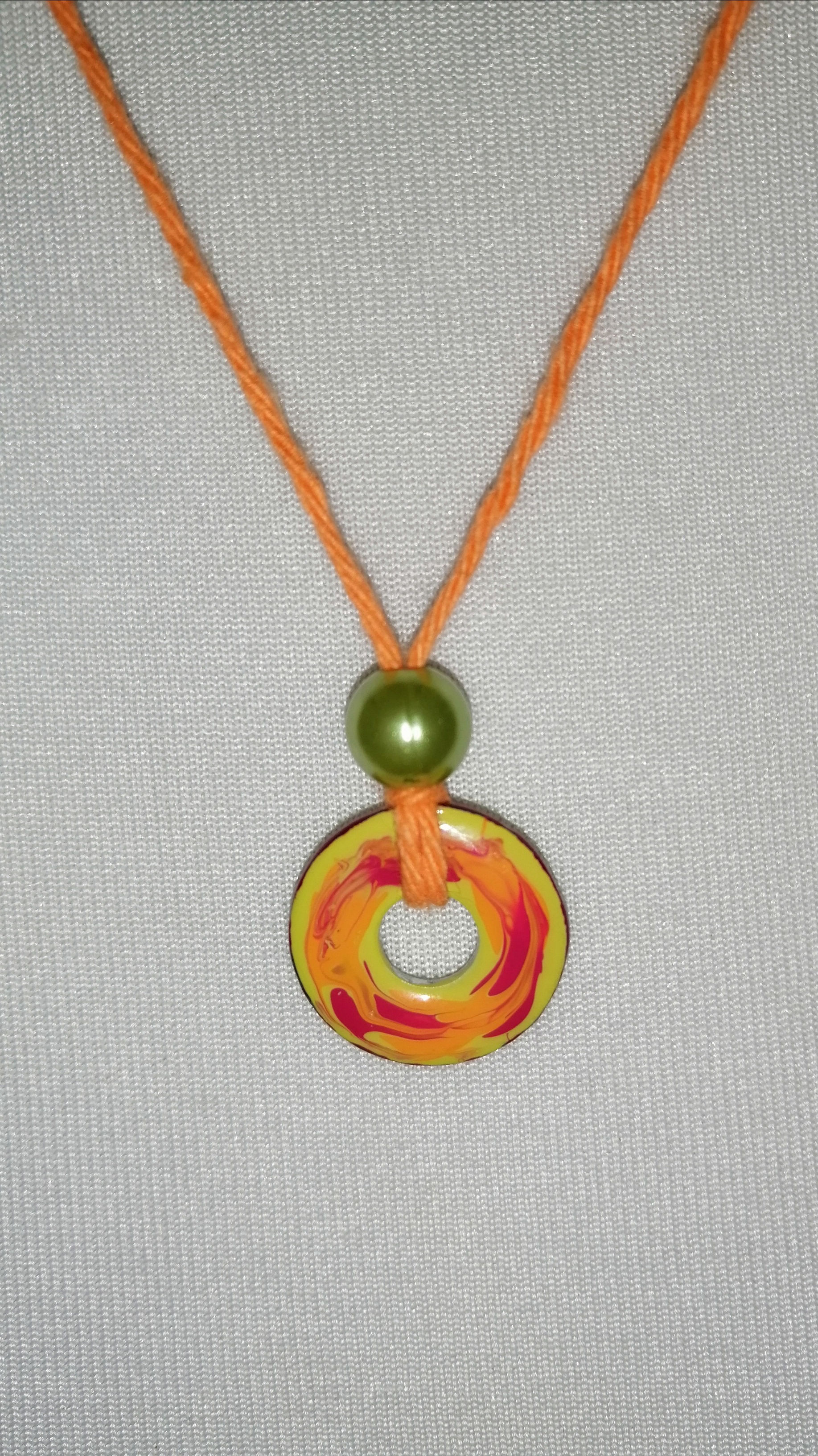Bei diesem Modell habe ich ein wenig experimentiert. Grundert habe ich den Anhänger auf beiden Seiten in einem kräftigen Orange, die Kanten sind in Sandtönen gehalten. Der Farbverlauf entstand durch einen speziellen Überlack, der je Schicht eine aufhellende Wirkung hat. Eine Kombination aus einer Eule und 3 Federn rundet das Bild optisch ab.