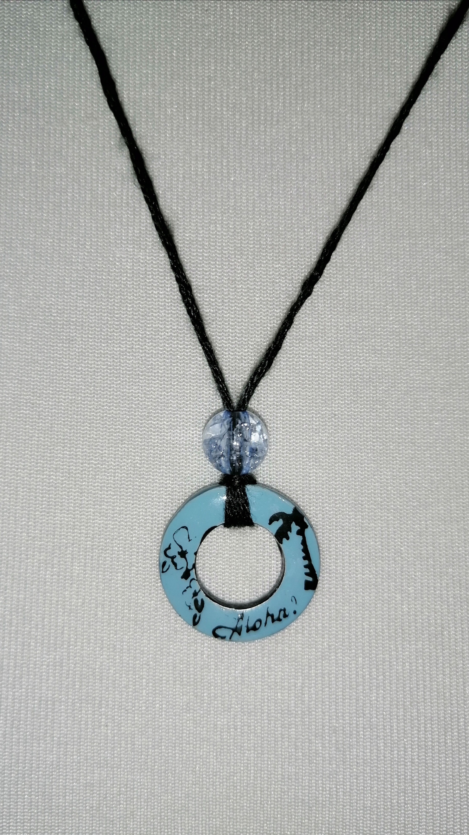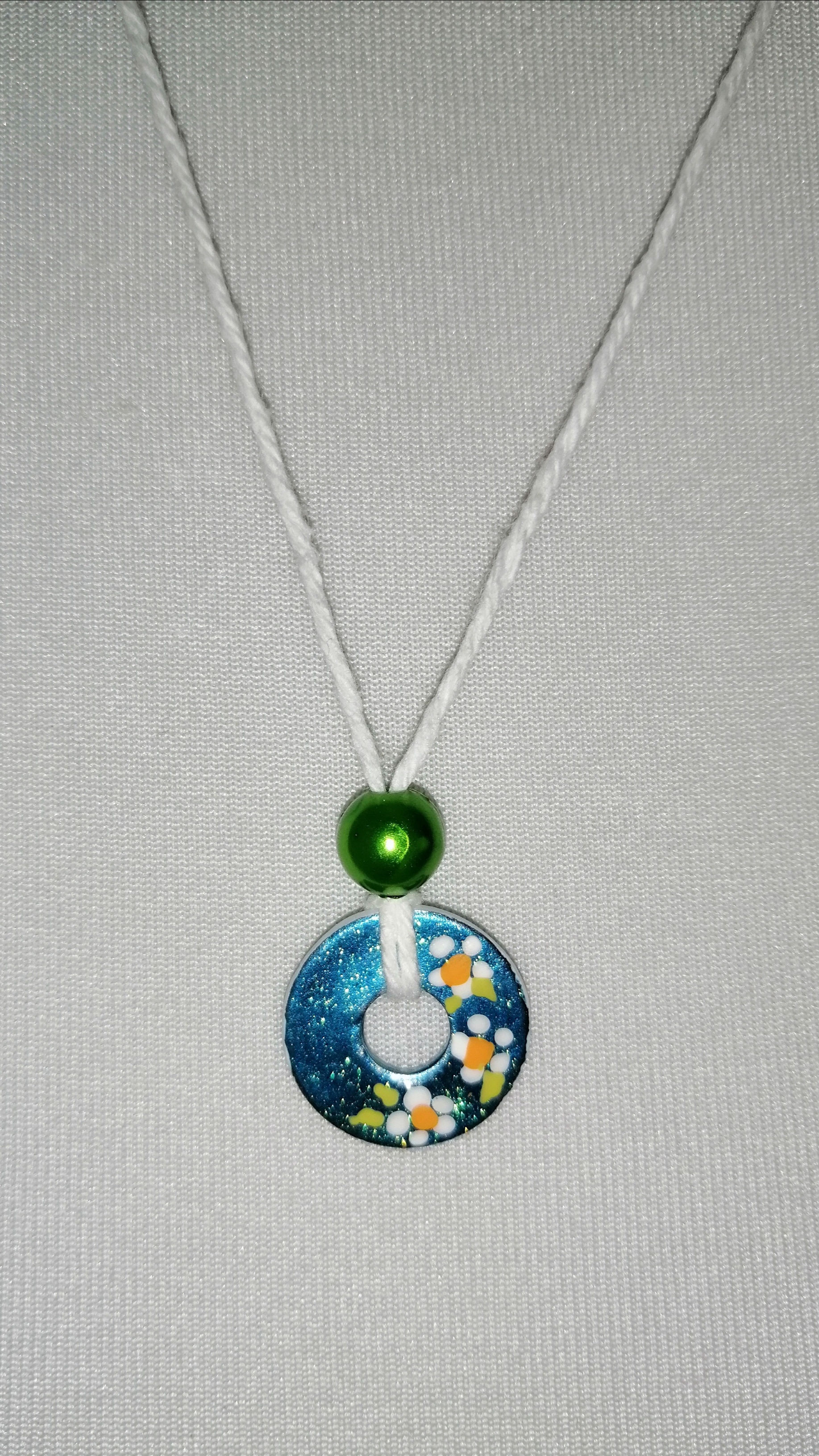 Grundiert in türkis mit zartem Glitzer überzogen und handgemalten Blümchen hat dieser kleine Anhänger seinen Auftritt.