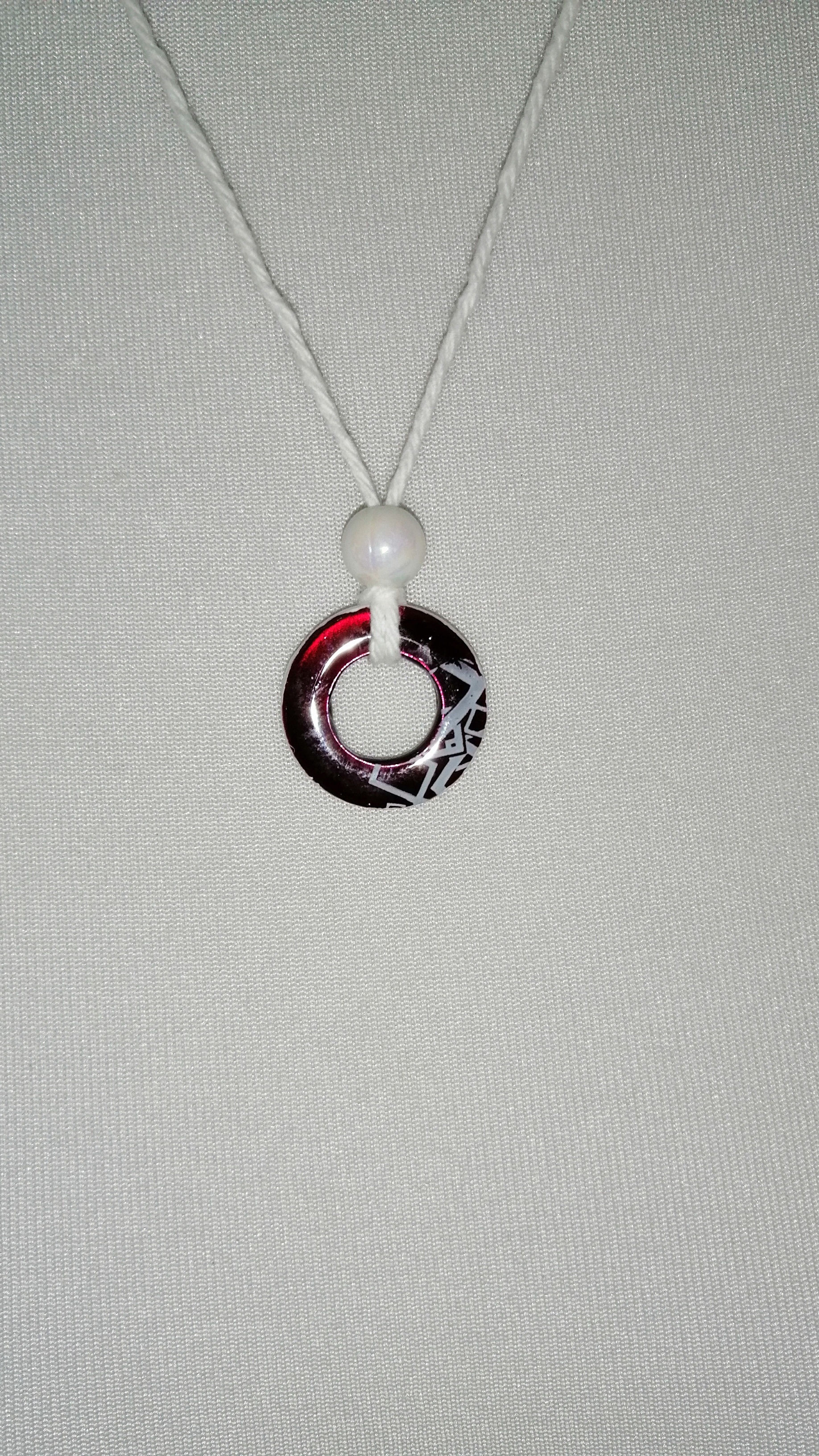 Das Kettenband besteht hier aus hochwertigem, silberfarbenem Stickgarn mit Perlglanz.