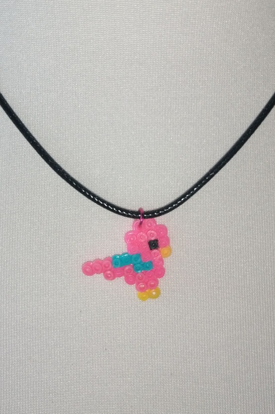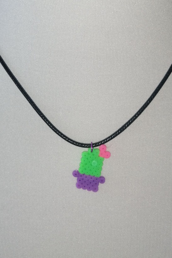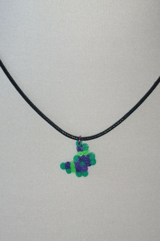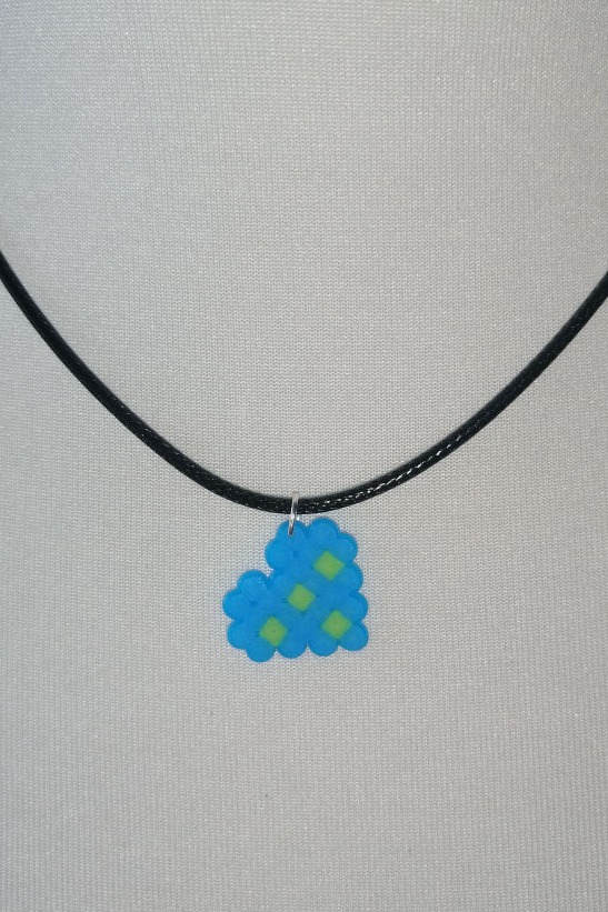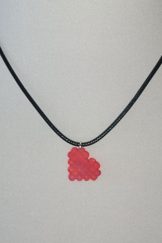 An Wachsschnurkette mit Metallverschluss (Modeschmuck). Die Verbindung zwischen Anhänger und Kette bildet ein Metallring.