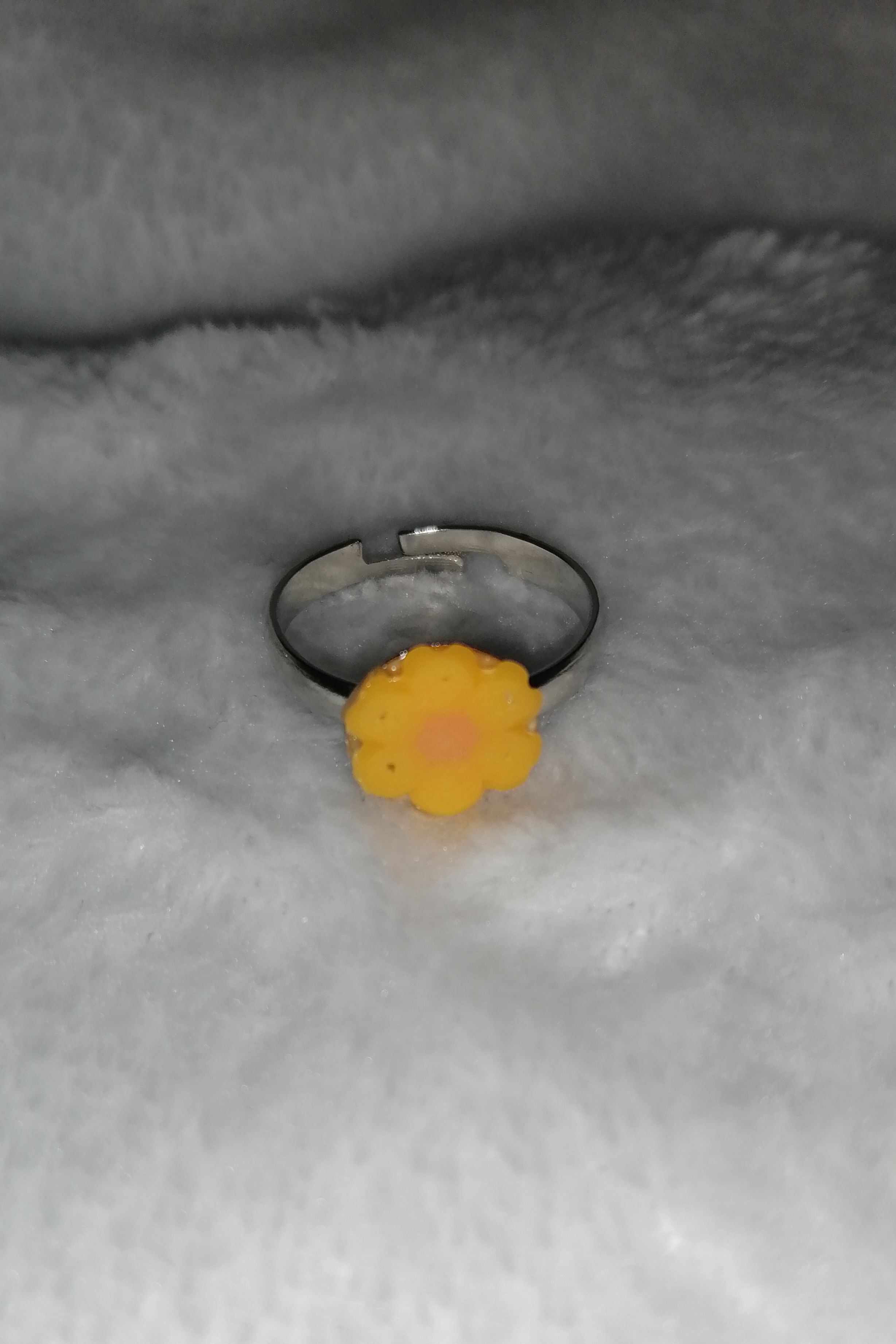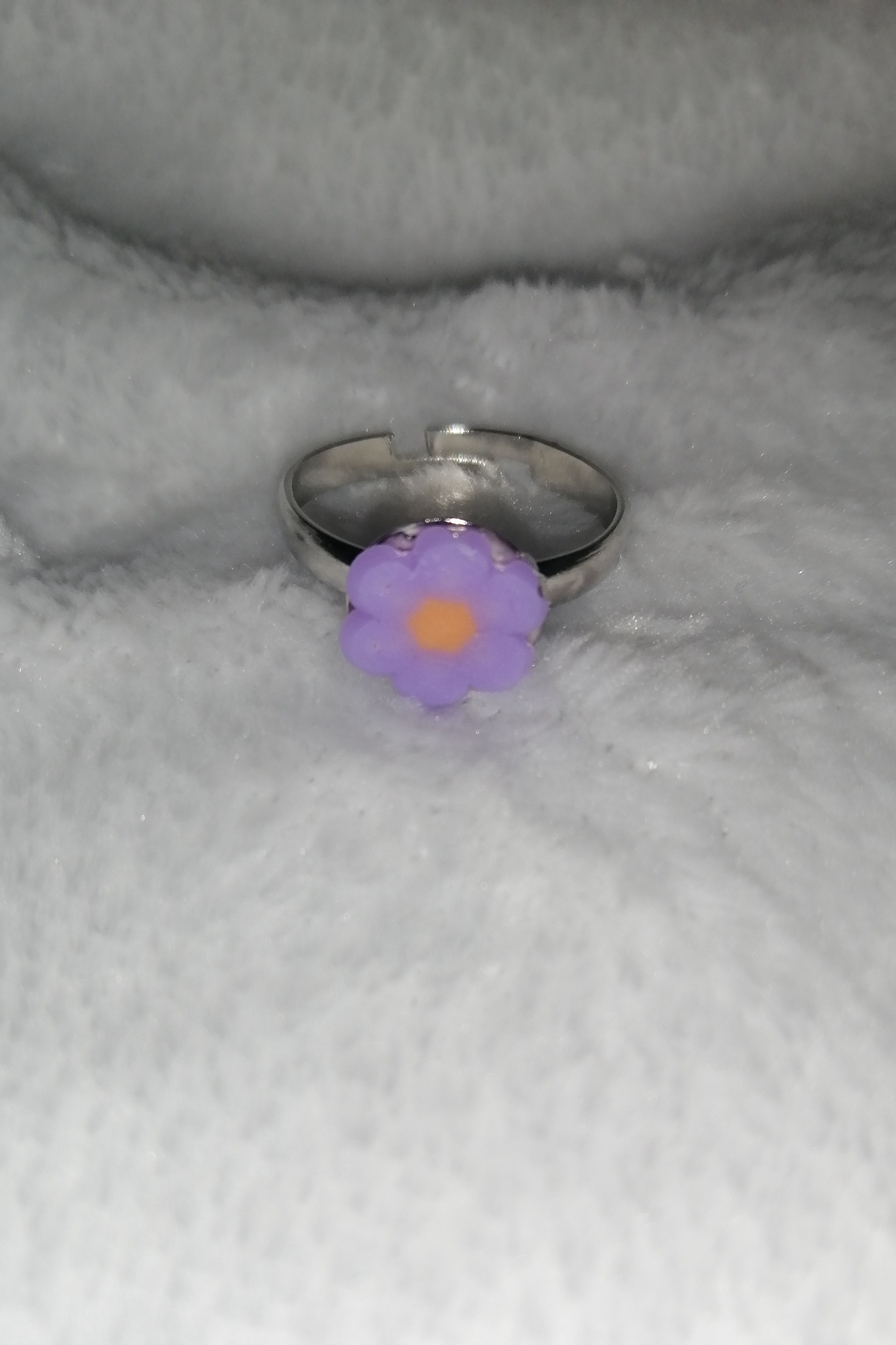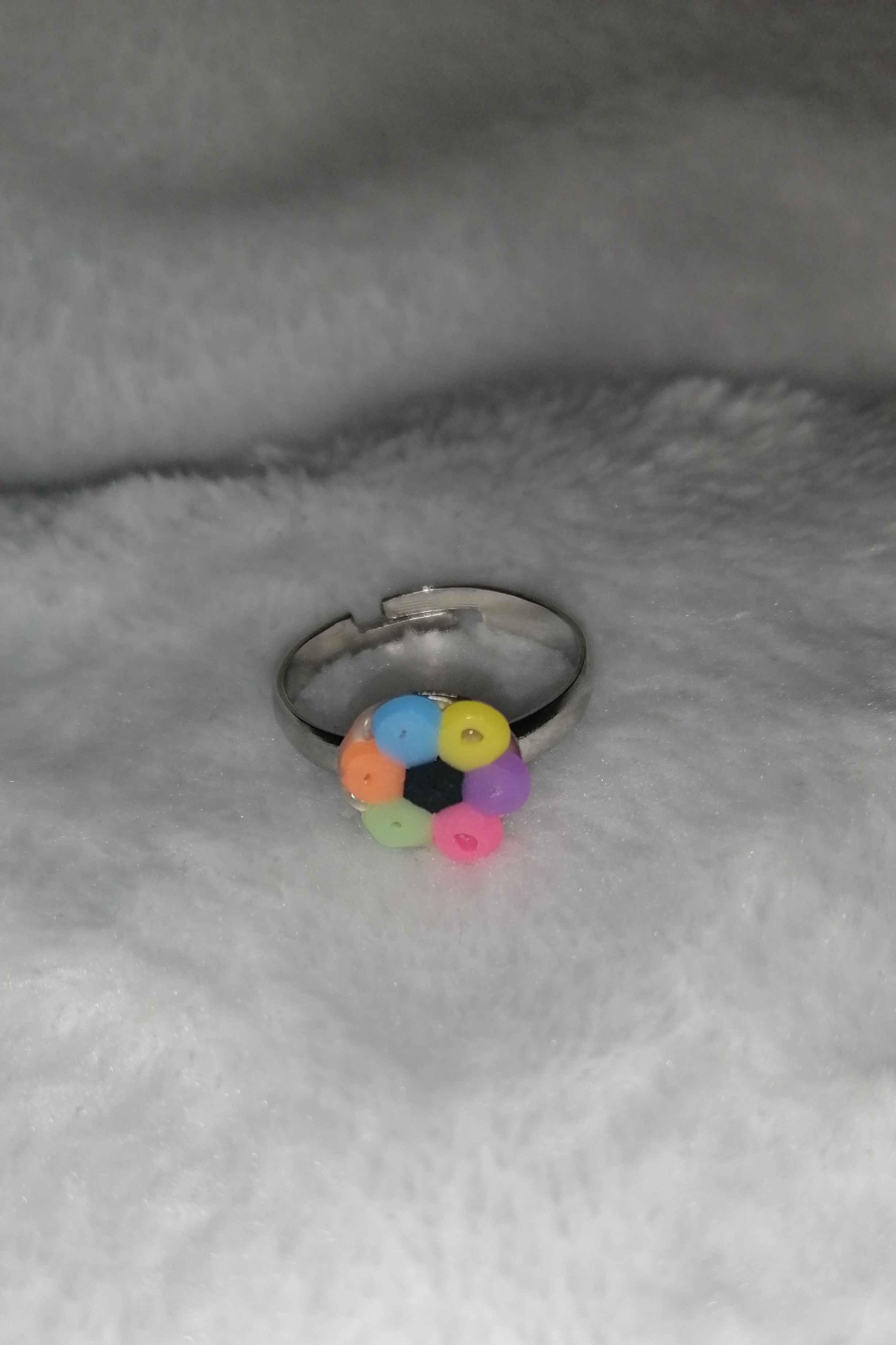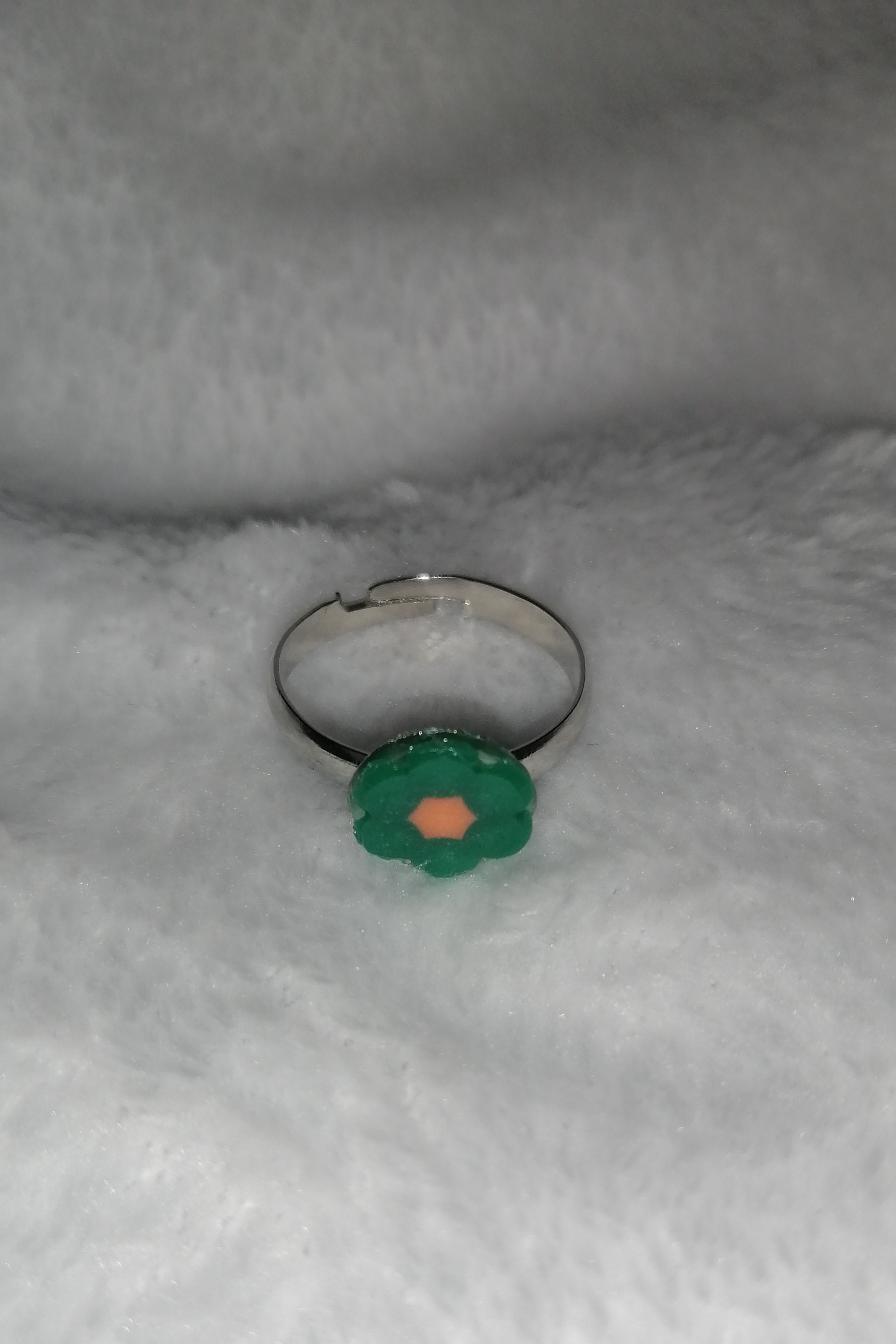 Auf verstellbarem Metallring (Modeschmuck). Verklebt mit Heißkleber, da die Platte des Rings etwas größer ist, kann stellenweise vom Kleber zu sehen sein.
